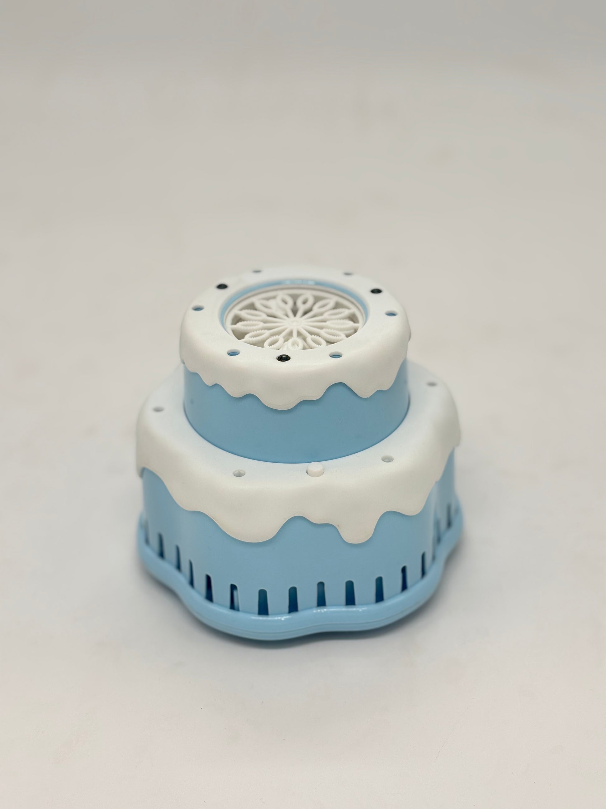 A cute cake-shaped automatic bubble blower with colorful lights and music, perfect for kids’ parties, outdoor play, and fun activities.