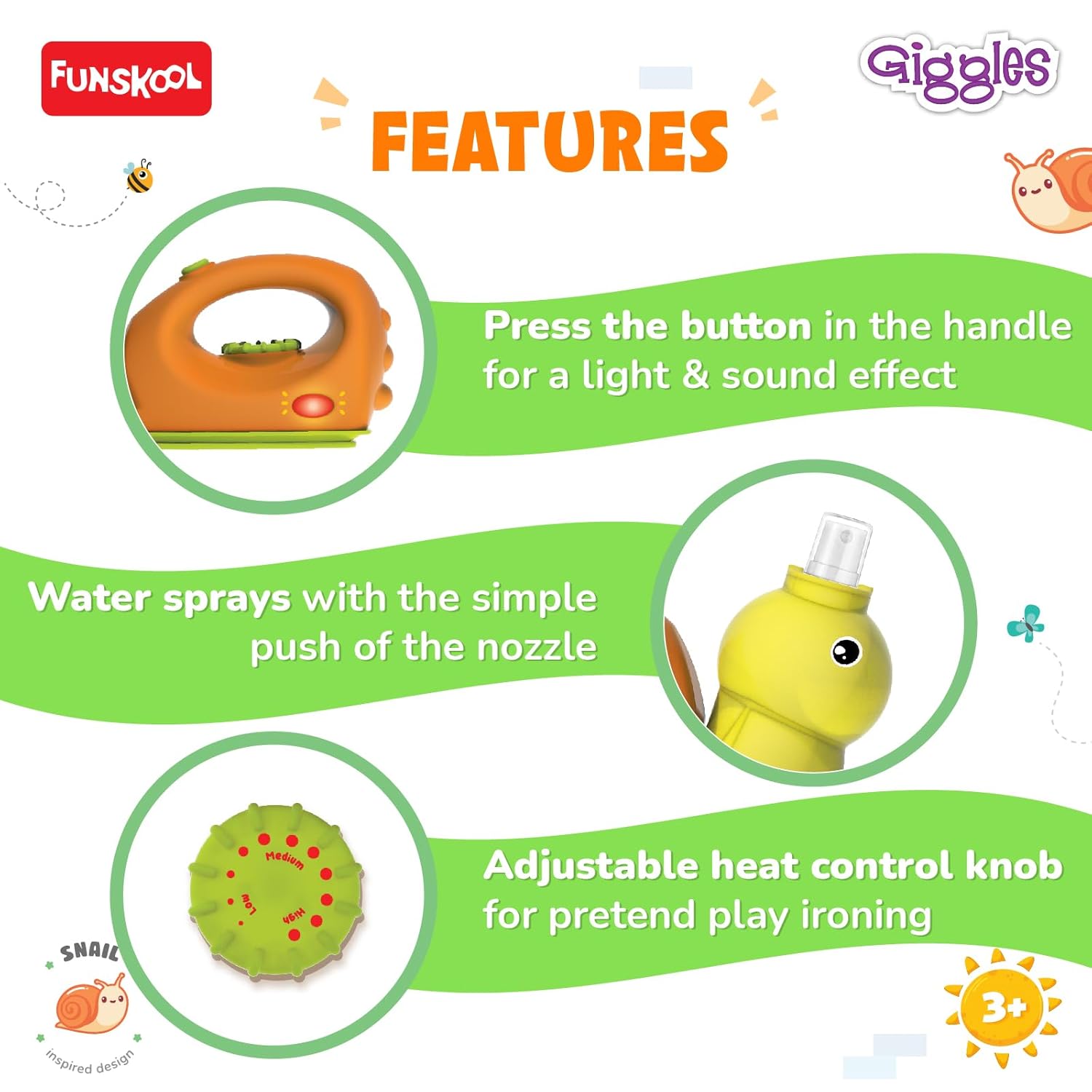 Funskool Giggles Playset Happy Lil Home-Iron, Snail Inspired Pretend Role-Play Toy with Electronic Lights & Sounds, for Kids 3 Year Old & Above.
