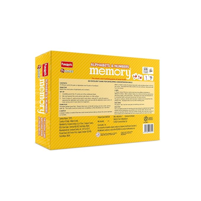 Funskool-Memory Alphabets And Nos, Educational matching picture game for children, Family Games,Strategy Board,Toys for Kids, 1 or more players, 3 years and Above, Multicolour