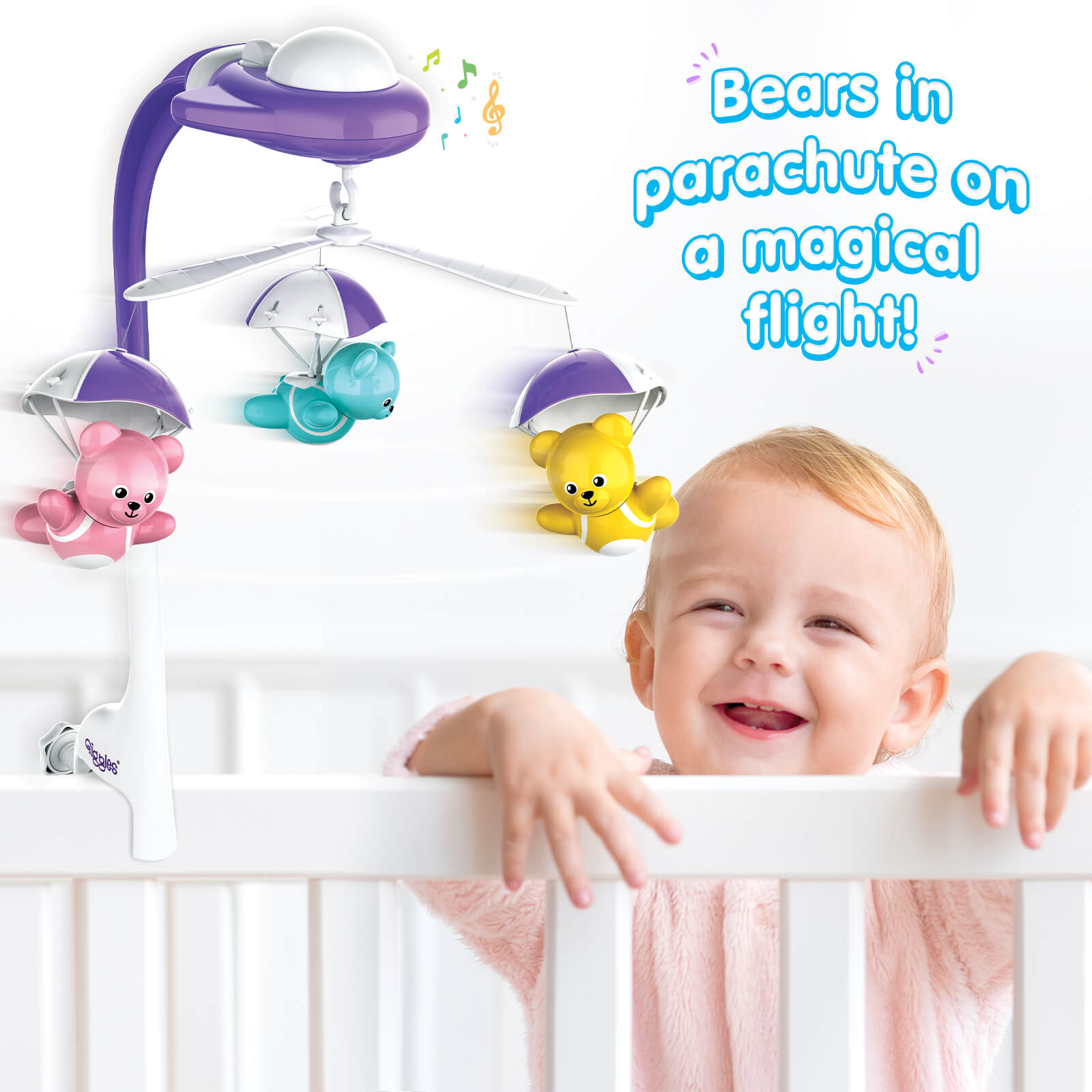 - WHAT’S INCLUDED: This calming crib mobile set comes with a top stand, a bottom stand featuring a secure clamping screw, a plane-shaped musical mobile unit, and a rotating fan that has 3 cute parachute bears (already put together).