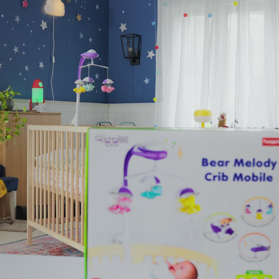 Introducing the Melody Crib Mobile,a charming addition to your baby’s crib.With three adorable bears twirling above,this crib mobile stimulates your little one’s senses with gentle motion and bright colors. Dersigned to build motorskills and dedvelopment,it also features soothing melody to create a calming bedtime routine.Easy to setup and crafted for safety, the Bear Melody Crib Mobile brings joy and sleep to your baby’s sleep time.