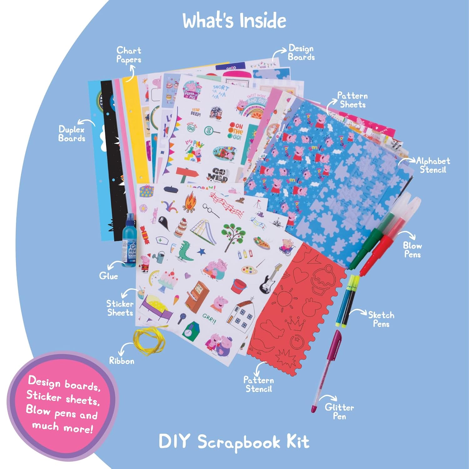 Unleash your creativity with the Peppa Pig DIY Scrapbook Kit! This delightful kit is perfect for young fans of Peppa Pig who love arts and crafts. With vibrant Peppa Pig-themed design sheets, colourful pattern sheets, sticker sheets, chart papers, stencils, glitter pen and blow pens, kids can design their very own scrapbook filled with fun memories. This kit is an exciting way to boost creativity—whether capturing memories, drawing, or writing. The scrapbook made with duplex boards and chart papers, help display and preserve artwork and memories beautifully. With easy-to-use materials and kid-friendly tools, this scrapbook kit provides endless hours of artistic fun! Let your child’s imagination shine with this Peppa Pig-themed scrapbook kit—a wonderful way to encourage creativity, storytelling and self-expression!