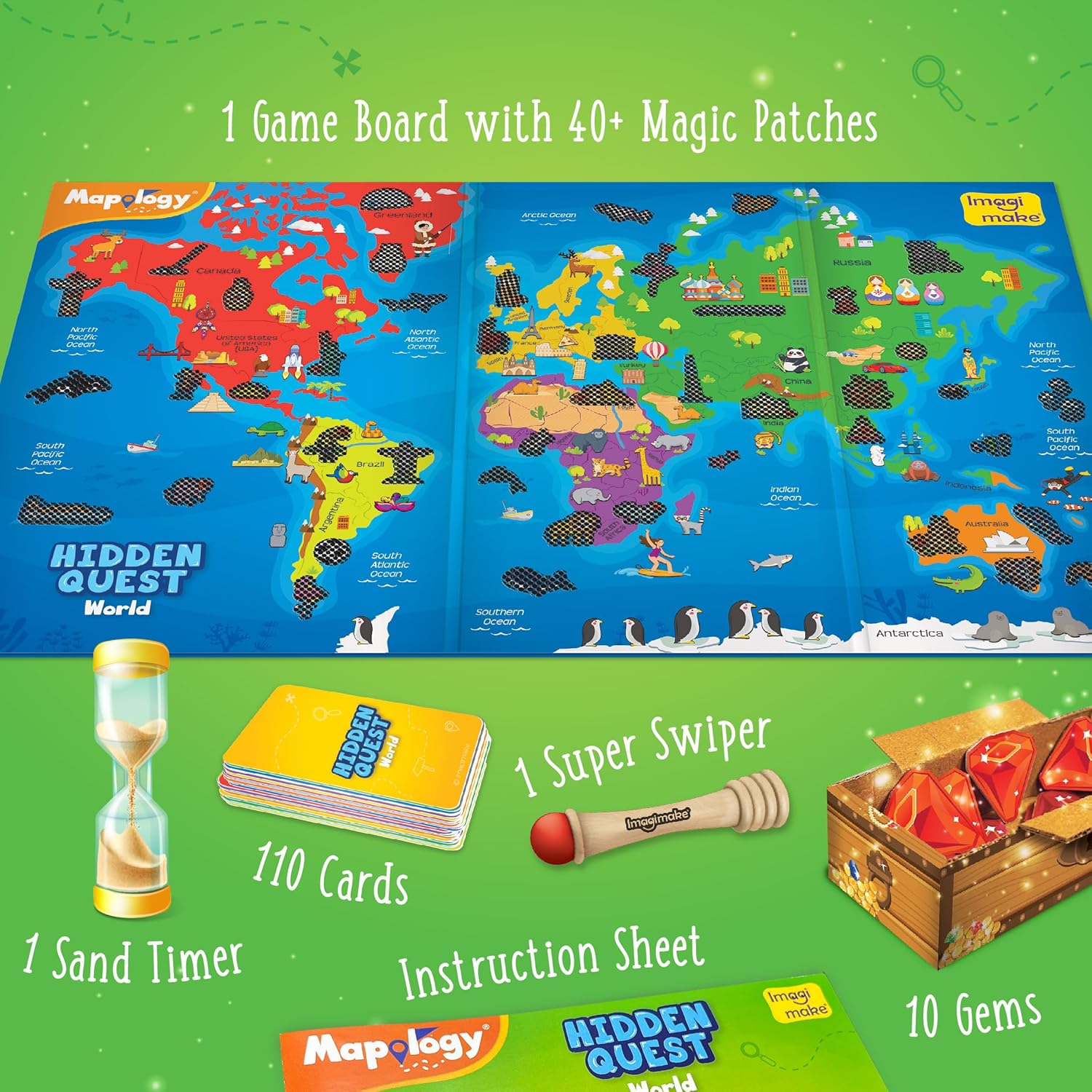 - SWIPE & REVEAL: This toys for kids has a special feature that some objects are hidden behind the magic patch on the board games for kids. The child can unleash the power of Super Swiper to reveal hidden treasures from around the world.