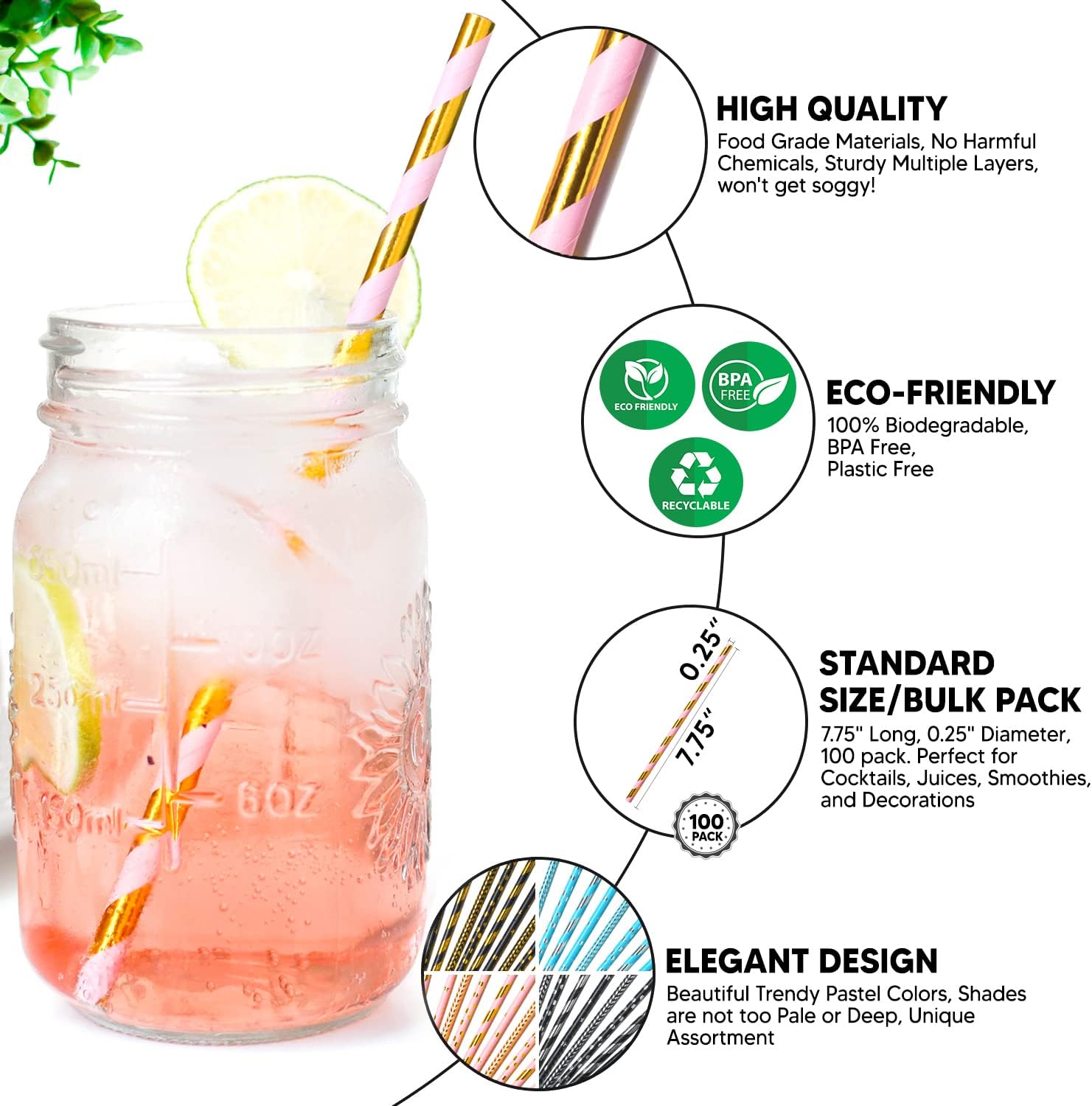 We make Biodegradable, Compostable, and Disposable paper straw bulk assortments in four patterns, Striped, Chevron waves, Stars, and Polka dots with two blends of beautiful colors, Pink and Gold. These cute and colorful Pink & Gold decorative paper straws will make any occasion special by enhancing the background with a touch of charm. Our pretty pink pastel straws are a great decoration accessory for Birthday, Bridal and Baby showers, Gender Reveal, Wedding, bachelorette party Bachelor party, Sip and See, Graduation, and Housewarming Parties. Also, adding these fun fancy gold straws for alcoholic drinks, drink straws Cocktails, Champagne, mocktails, mojitos, and smoothies will brighten the drinks even more. These pastel colored party paper straw sticks can be used for cake pop sticks, Rice crispy treats, Candy apple sticks, and in various crafts. Eco-friendly biodegradable drinking paper straws are made with Non - BPA, food-safe materials. These multi-layered, strongest paper straws retain their shape in any warm or cold beverages. Have fun and celebrate all your achievements. Thank you for making us a part of your celebration and contributing to reducing plastic waste.