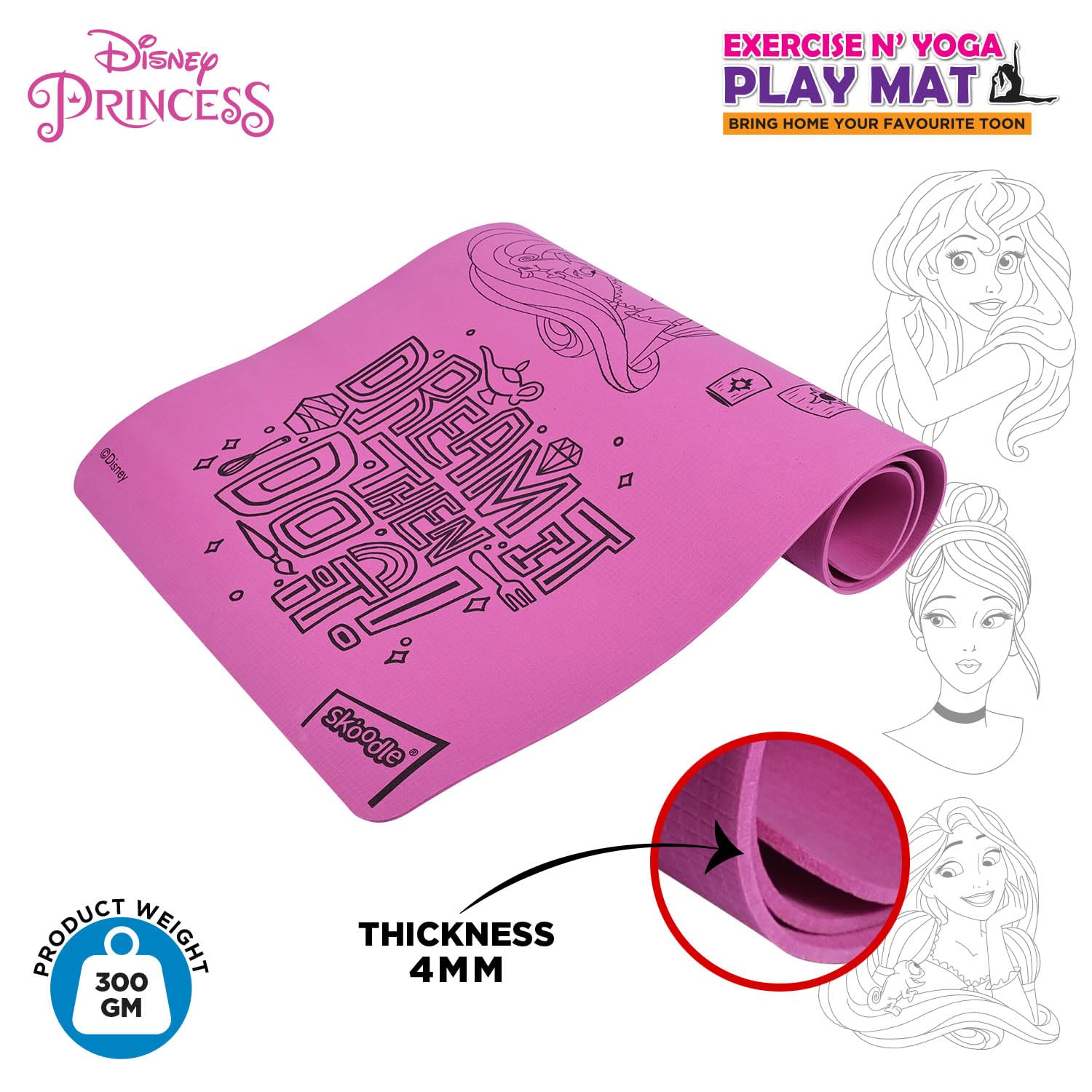 SKOODLE Disney Princess Kids Yoga Mat Anti-Skid, Washable & Non-Toxic Durable & Portable (22x58) inches Travel Friendly Carrying Strap Varied Colors Ages 3+