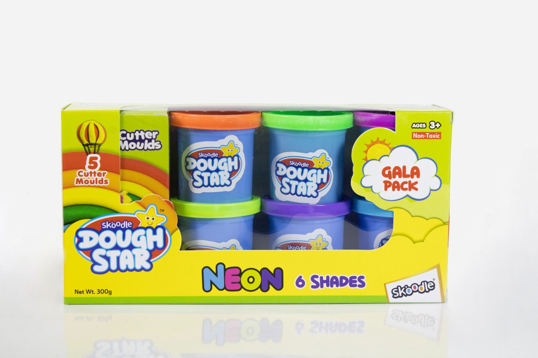 SKOODLE Dough Star Gala Pack 300gm, 5 Cutter Moulds & 6 Neon Shades of Non-Toxic Modelling Clay Dough for Kids, Creative Art & Craft Gift for Children 3 Years and Up