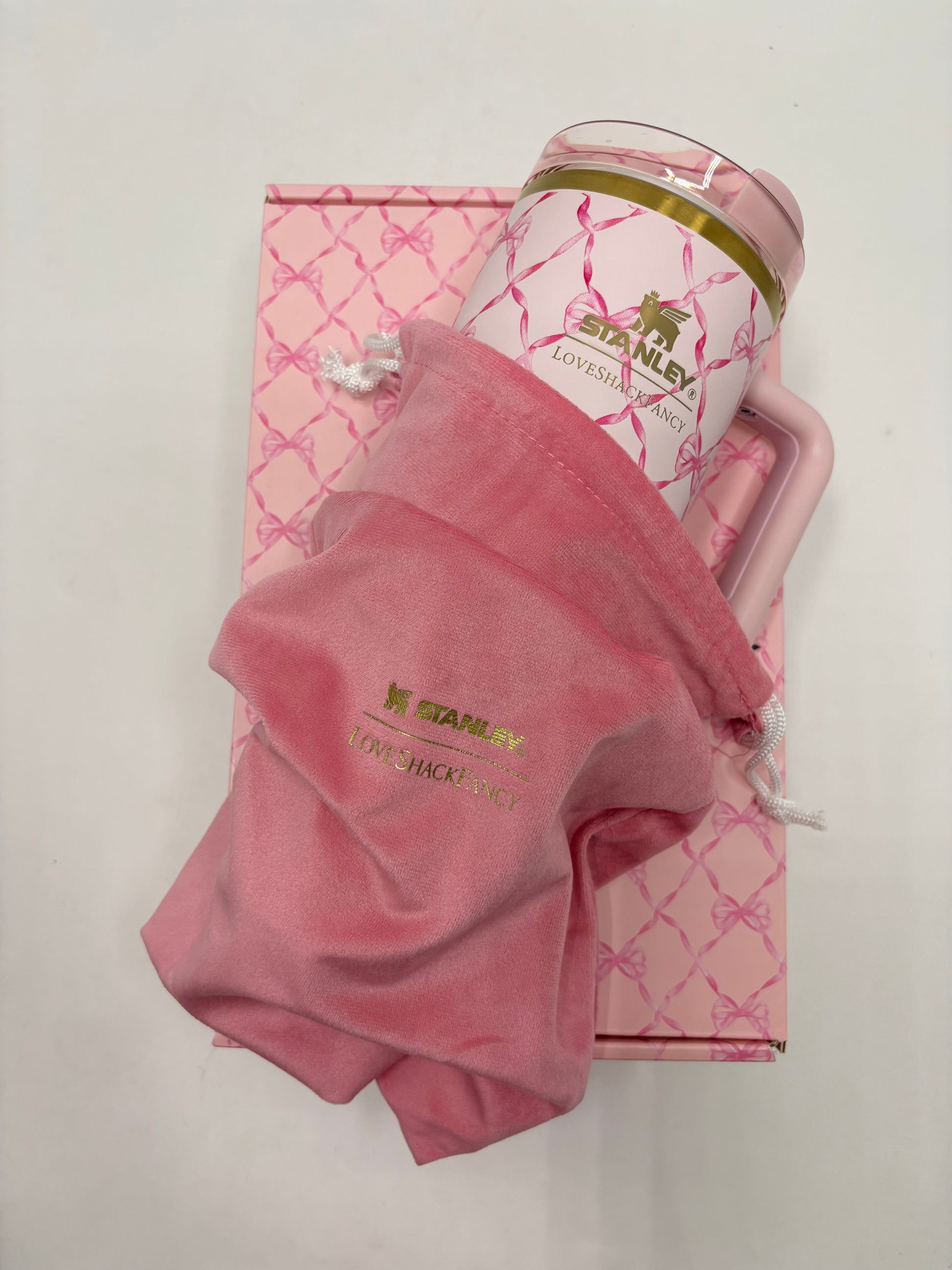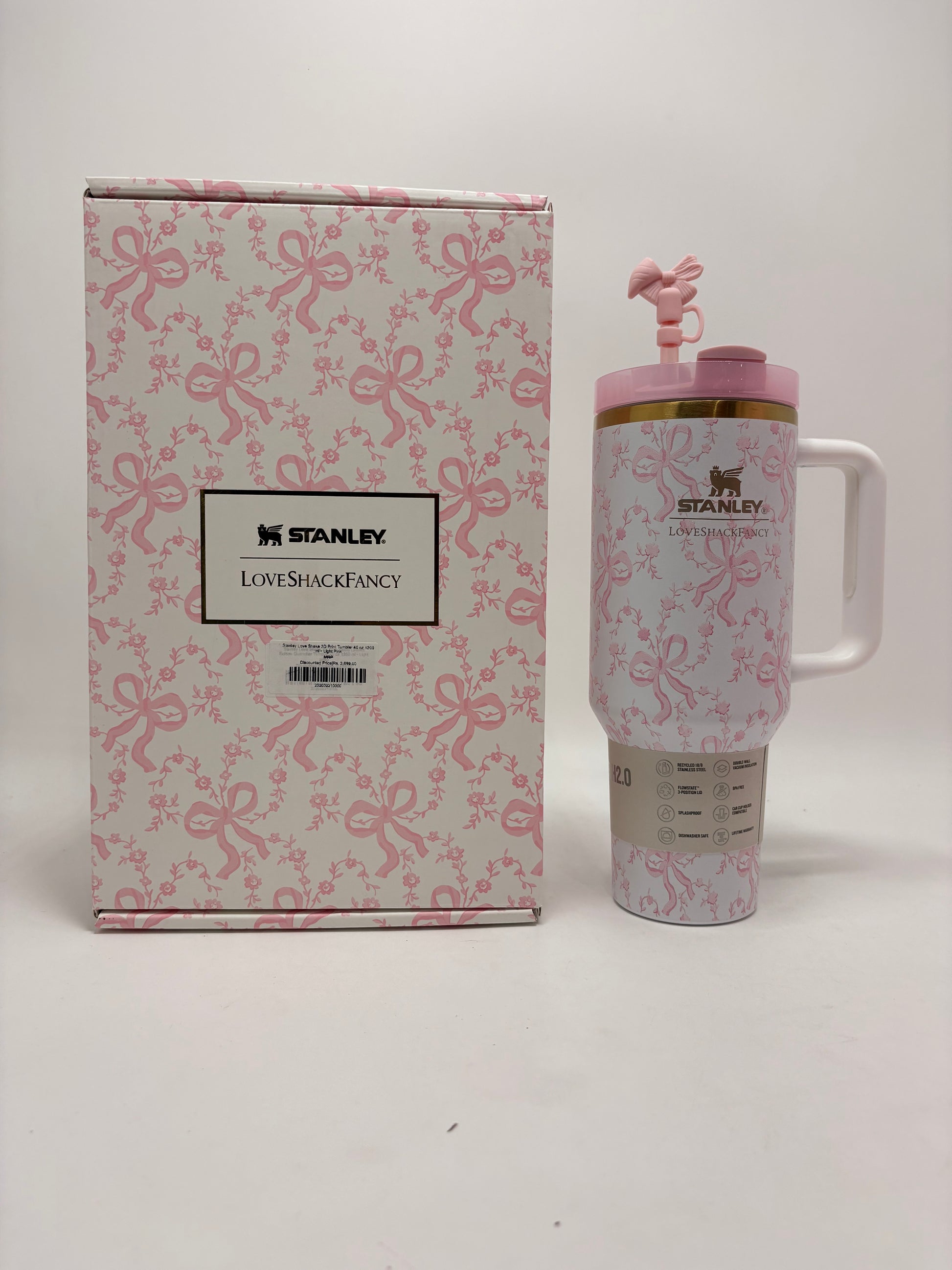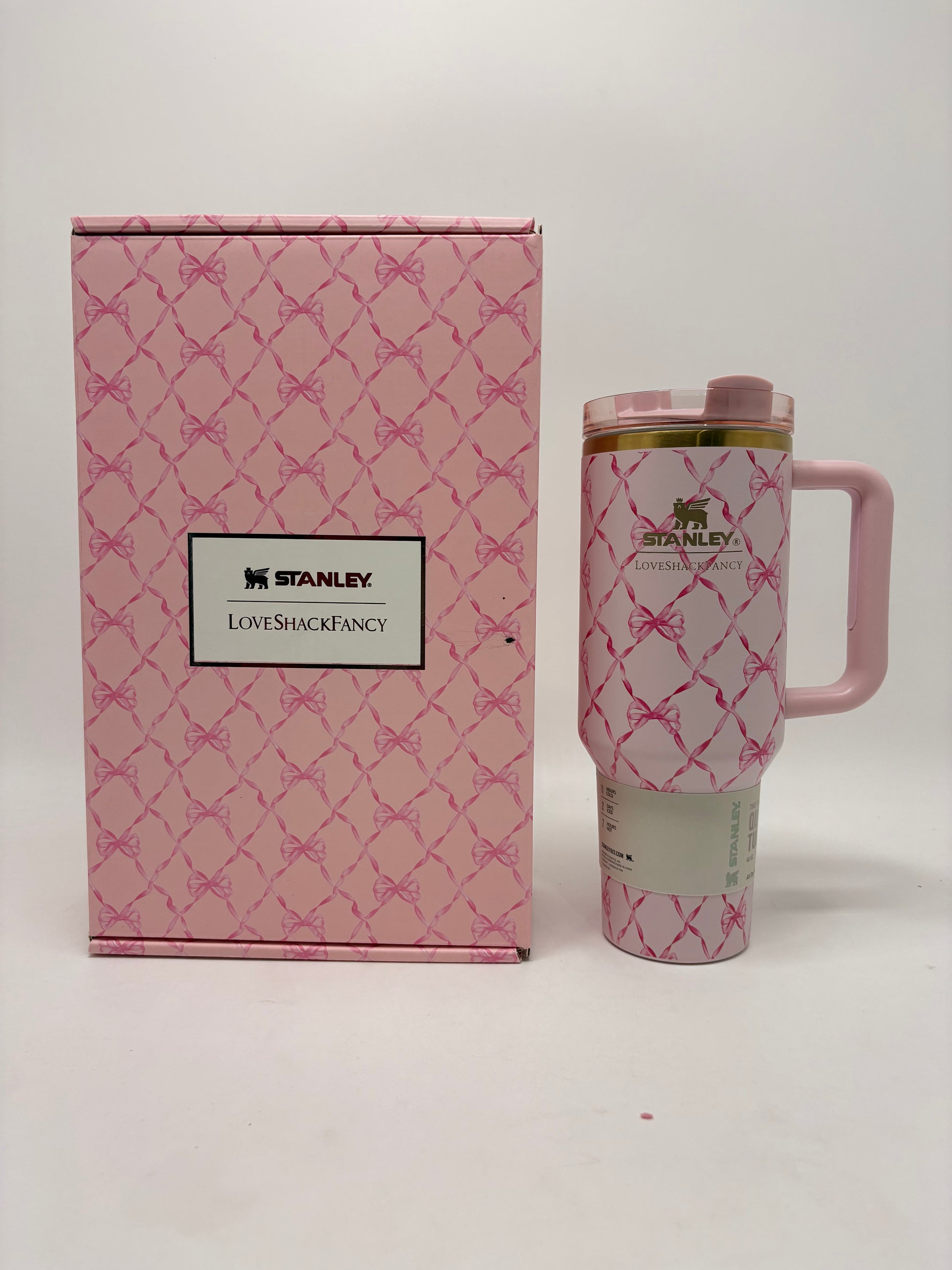 A stunning limited edition Stanley x LoveShackFancy 40 oz Quencher featuring elegant 3D bow print detailing, premium gift packaging, and iconic Stanley insulation performance.