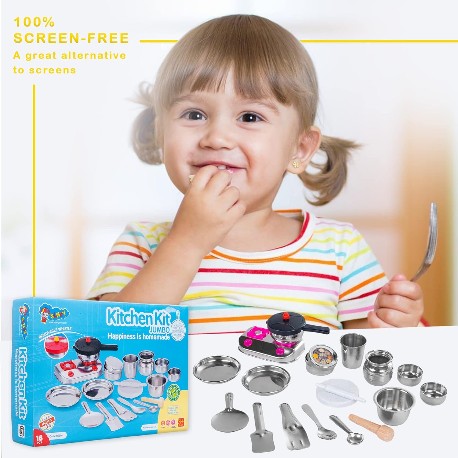 Sunny 18 Pieces Kitchen Kit Jumbo Set Stainless Steel Utensils | A Perfect Role Play Kitchen Set Toys for Girls Kids | Certified as per Indian Standards is 9873, Safe & Durable for Kids