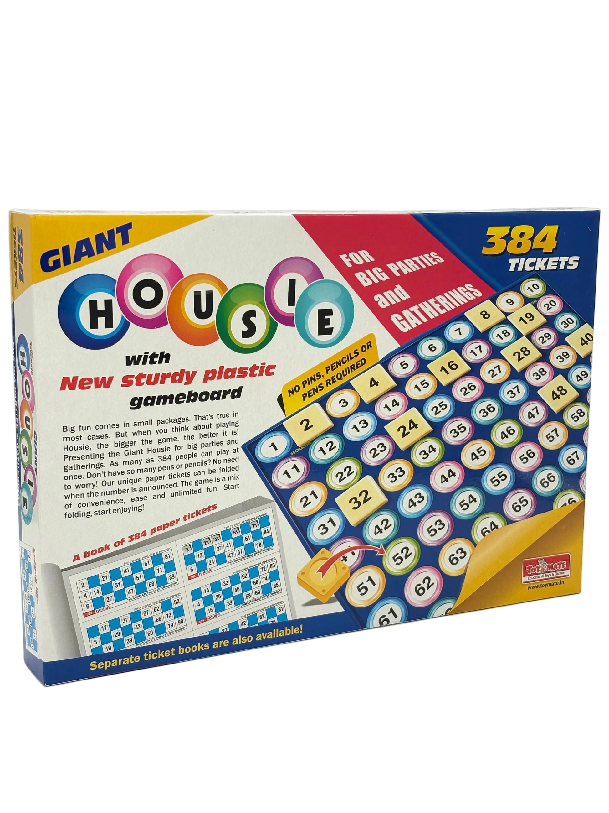 A complete giant Housie game set with 384 tickets and a sturdy plastic gameboard, perfect for parties, kitty gatherings, and large group events.